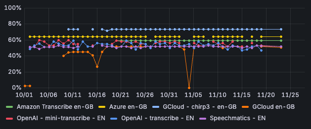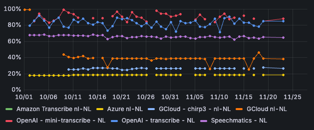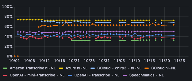 Deze dataset blijft continu groeien. We analyseren nieuwe talen, nieuwe variaties, gebruiken nieuwe stemmen en voegen nieuwe STT engines toe. We testen dus niet alleen de bekendere engines zoals Azure en Google, maar ook nieuwere spelers zoals OpenAI Mini Transcribe en ElevenLabs Scribe.