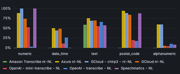 Zo kan Google Chirp3 op onderdelen ogenschijnlijk lager scoren dan Azure, terwijl het verschil vooral zit in de vorm van de output die Seamly nog niet volledig normaliseert. Niet alle variaties kunnen we op dit moment al volledig gelijk trekken, waardoor een engine in bepaalde gevallen lager lijkt te scoren dan in werkelijkheid het geval is. De resultaten van de input types numeriek, datums en tijden, alfanumeriek en postcodes kunnen daarom niet los worden gezien van de context van het Seamly platform.