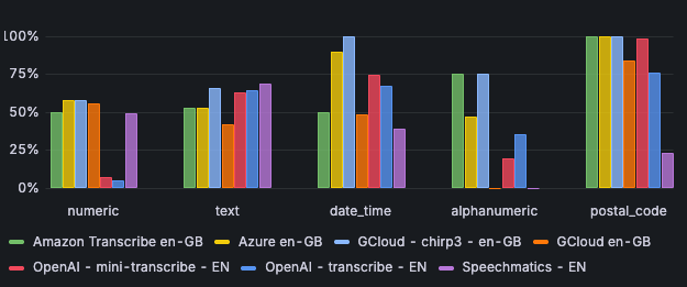 Voor het Engels scoren alle engines goed op het verwerken van postcodes, behalve Speechmatics. Daar is de correctness slechts 23%.